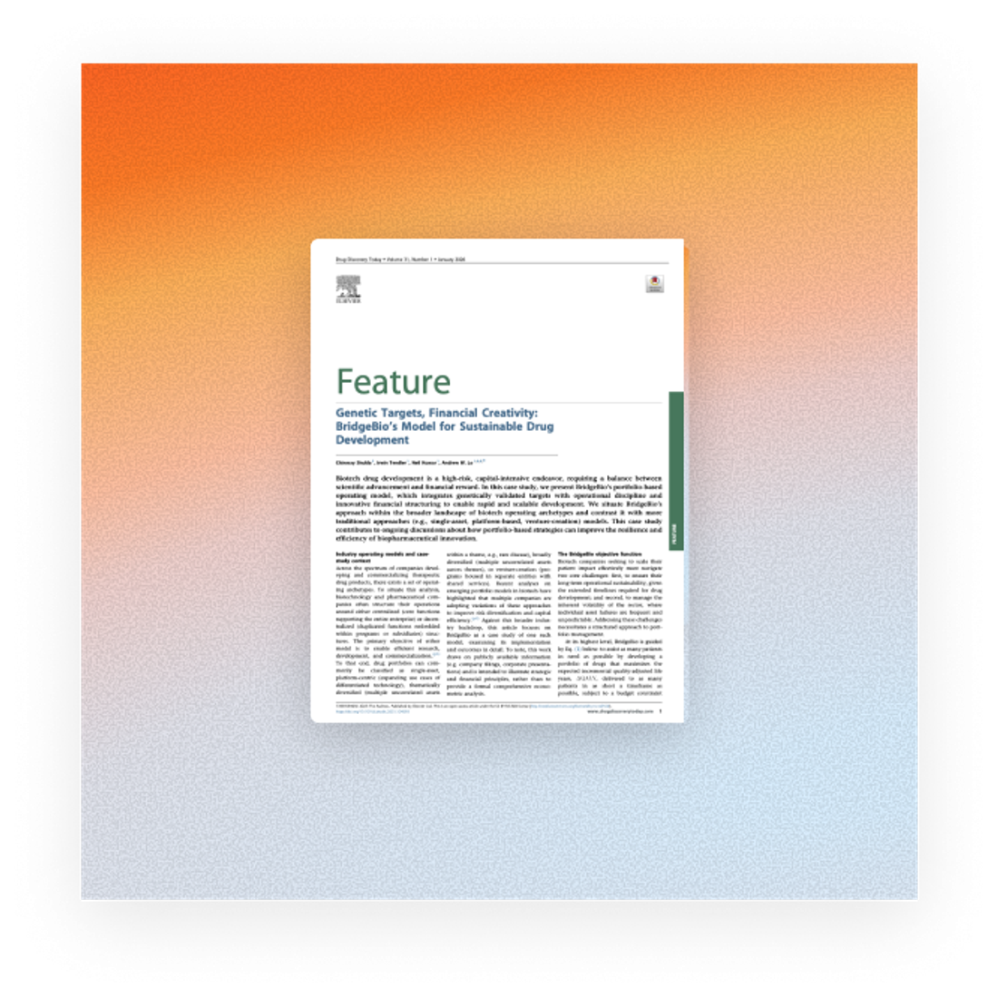 Biotech drug development is a high-risk, capital-intensive endeavor, requiring a balance between scientific advancement and financial reward. In this case study, we present BridgeBio’s portfolio-based operating model, which integrates genetically validated targets with operational discipline and innovative financial structuring to enable rapid and scalable development. We situate BridgeBio’s approach within the broader landscape of biotech operating archetypes and contrast it with more traditional approaches (e.g., single-asset, platform-based, venture-creation) models. This case study contributes to ongoing discussions about how portfolio-based strategies can improve the resilience and efficiency of biopharmaceutical innovation.