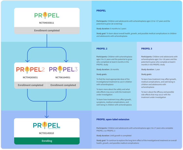 The PROPEL clinical program is studying a wide range of outcomes related to growth, medical challenges, and quality of life in children and adolescents with achondroplasia.1