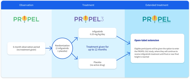 Participants who complete at least 6 months in the PROPEL study may enroll in PROPEL 3. The primary goal of PROPEL 3 is to understand the effect of oral infigratinib on bone growth, as measured by annual height velocity (or AHV). This study will also look at the impact of the investigational treatment on physical functioning and quality of life.2