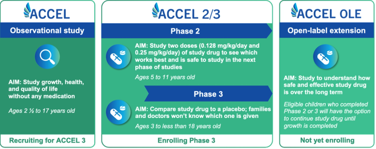 Children and adolescents must participate in the ACCEL observational trial for 6 months or longer to be eligible for participation in the Phase 2 or Phase 3 studies.1